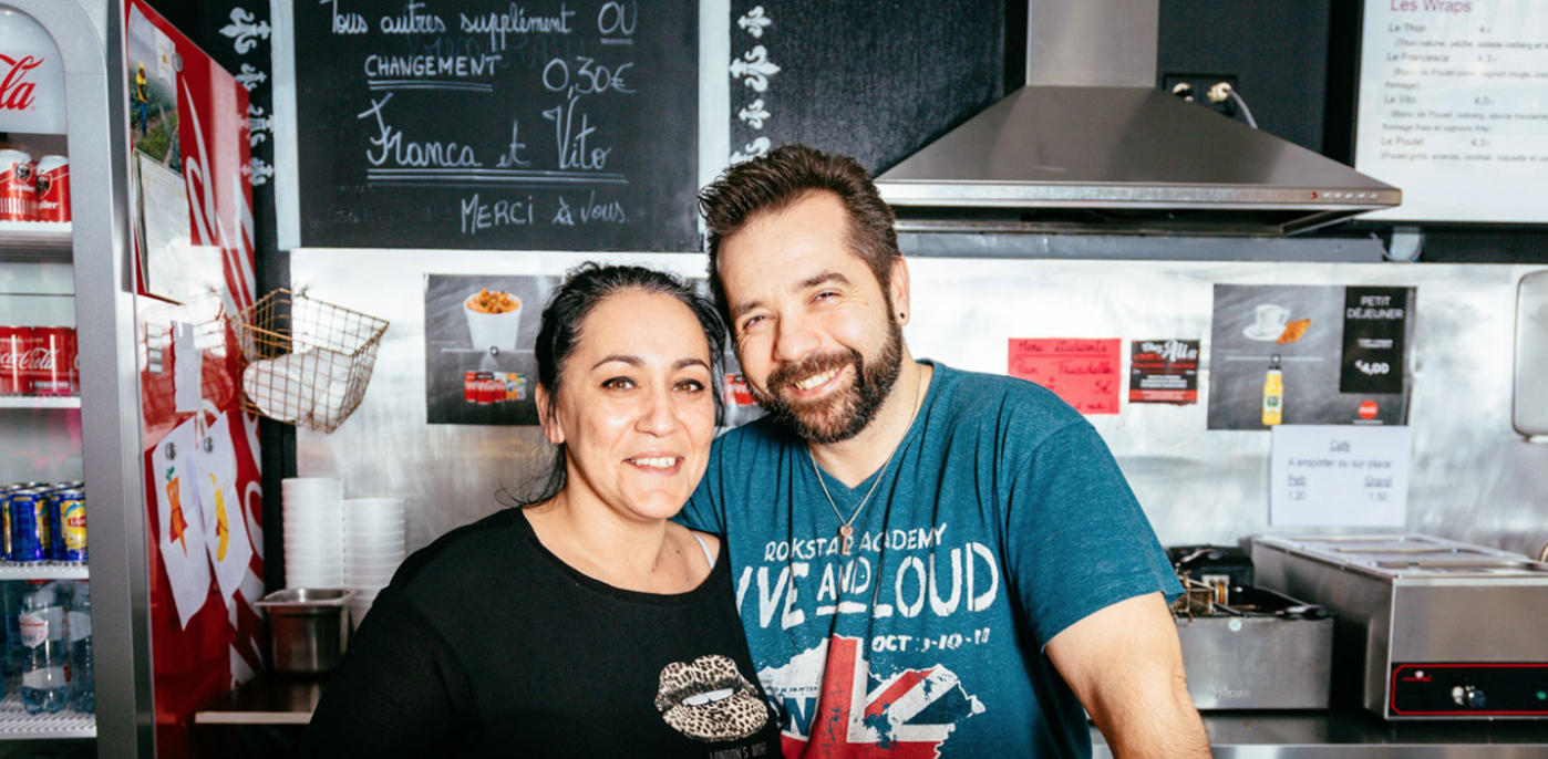 Bienvenue chez Franca & Vito, sandwicherie fine italienne située à quelques pas de la gare des Guillemins mais aussi située aux abords de plusieurs écoles supérieures. Pour eux, ça marche bien, même très bien ! Le couple a repris la sandwicherie en septembre 2017 grâce à leur épargne et un microcrédit de 15.000 Euros ; la nièce de Mme Schimmenti était la précédente gérante de l’établissement. Après une carrière dans le monde de l’électronique où Franca y travaillait comme monteuse-câbleuse, elle y a reçu son C4 pour restructuration. Lorsqu’elle a rencontré MicroStart pour la première fois en février 2017, elle n’avait pas accès à la gestion car seulement en possession de son CESS ; c’est pourquoi, elle a suivi les cours accélérés de gestion chez MicroStart donnés par Louis. Depuis septembre 2017, le couple travaille d’arrache-pied pour livrer chaque jour des produits de qualité à leur clientèle ; Mme Schimmenti cuisine toutes les sauces de ses pâtes chez elle le soir tout en assurant également la gestion des devoirs de leurs 8 enfants. Après les avoir déposé à l’école le matin, c’est le rush au commerce jusqu’à 16h !