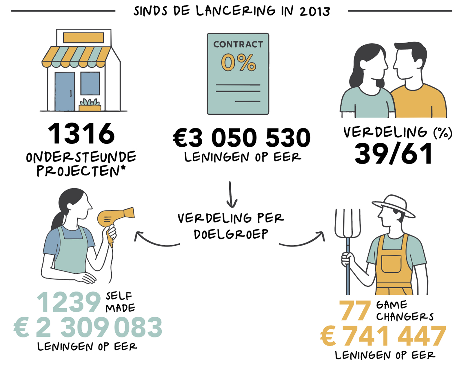 Concreet betekent dit dat we onze expertise en tools ter beschikking stellen van organisaties die ze willen gebruiken om ondernemers te ondersteunen die bijzonder kwetsbaar zijn voor discriminatie of om belangrijke maatschappelijke en ecologische thema’s aan te pakken. Deze aanpak heeft de toegang tot leningen op eer en begeleiding vergroot dankzij nieuwe samenwerkingen. We hebben met name twee specifieke initiatieven gelanceerd: vrouwelijk ondernemerschap en landbouwtransitie.