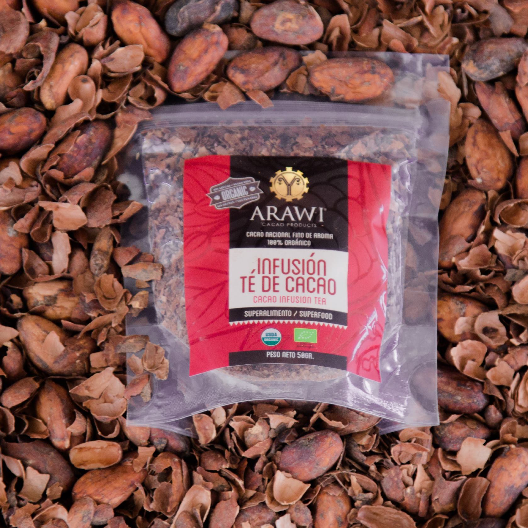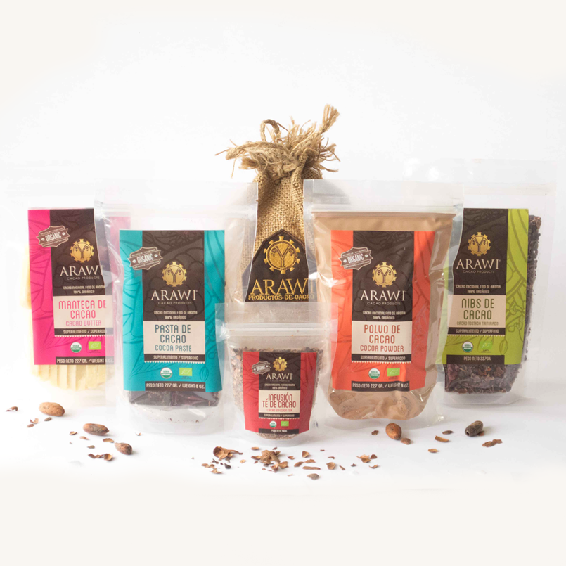 ARAWI est une entreprise familiale en Equateur qui cultive environ 400 hectares de cacao et le transforme en pâte, beurre, nibs, poudre, infusions, etc. Tous les produits ARAWI sont issus d’une agriculture biologique et possèdent la certification bio. Le promoteur nous explique que le cacao équatorien est mondialement reconnu pour la qualité de son arome même si l’aspect est moins attirant que le cacao provenant d’Afrique. Il est sans sucre et sans colorant. ARAWI, qui en langage Kichuwa signifie poésie – une poésie d´arômes et saveurs -, est une marque récente (5 ans) de produits dérivés de cacao. Actuellement, ils proposent de la pâte, du beurre, de la poudre, grue (nibs) et des infusions à base de cacao 100% biologique.