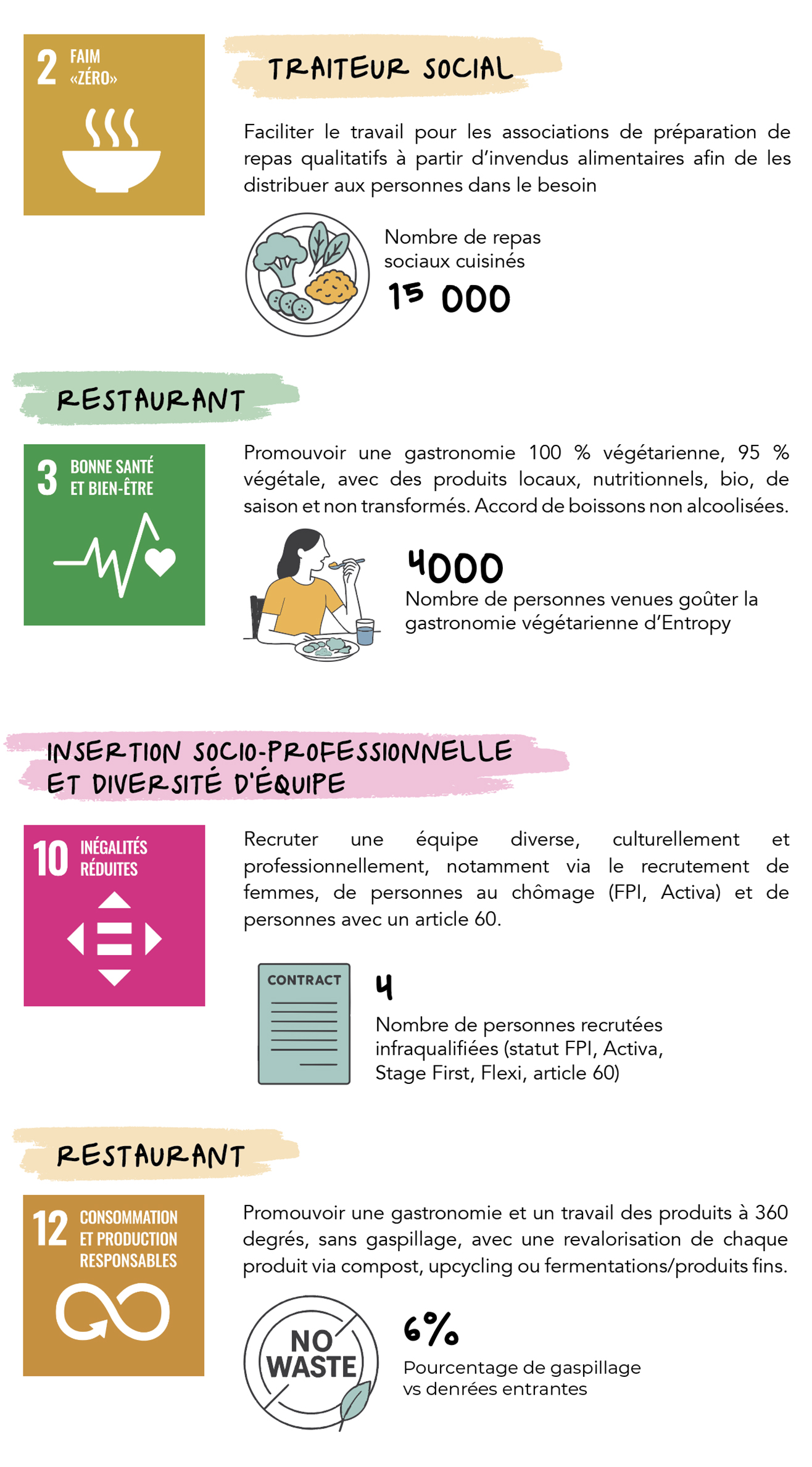 Hearth Project est né d’une envie de changer les choses en combinant l’aspect durable, solidaire et gastronomique du monde de l’Horeca. Ce projet social allie la récupération d’invendus alimentaires, la préparation de repas pour les personnes dans le besoin et l’organisation d’ateliers de sensibilisation. Ces trois actions sont financées par leur restaurant gastronomique Entropy, qui représente la vitrine de leur savoir-faire en matière de cuisine végétale intuitive à partir d’invendus alimentaires.