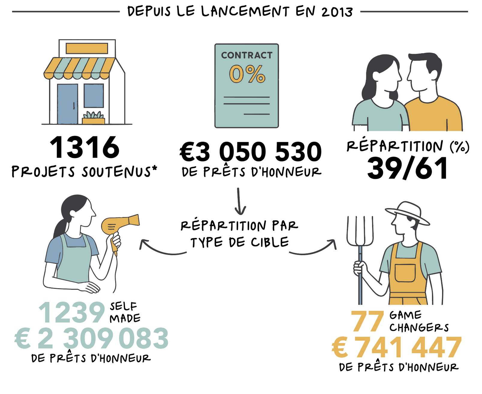 Concrètement, cela signifie que nous mettons notre expertise et nos outils à la disposition d’organisations qui souhaitent les utiliser pour soutenir des entrepreneur.e.s particulièrement exposé.e.s à des discriminations ou aborder des thématiques particulières d’importance sociétale et environnementale. Cette démarche a permis d’étendre l’accès au prêt d’honneur et à l’accompagnement, via de nouveaux partenariats, à des personnes que nous n’aurions peut-être pas accompagné.e.s dans le passé. Nous avons notamment lancé deux initiatives spécifiques : l’Entrepreneuriat Féminin et la Transition Agricole.